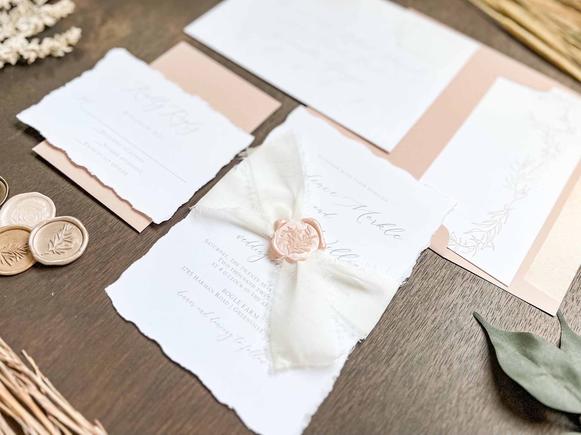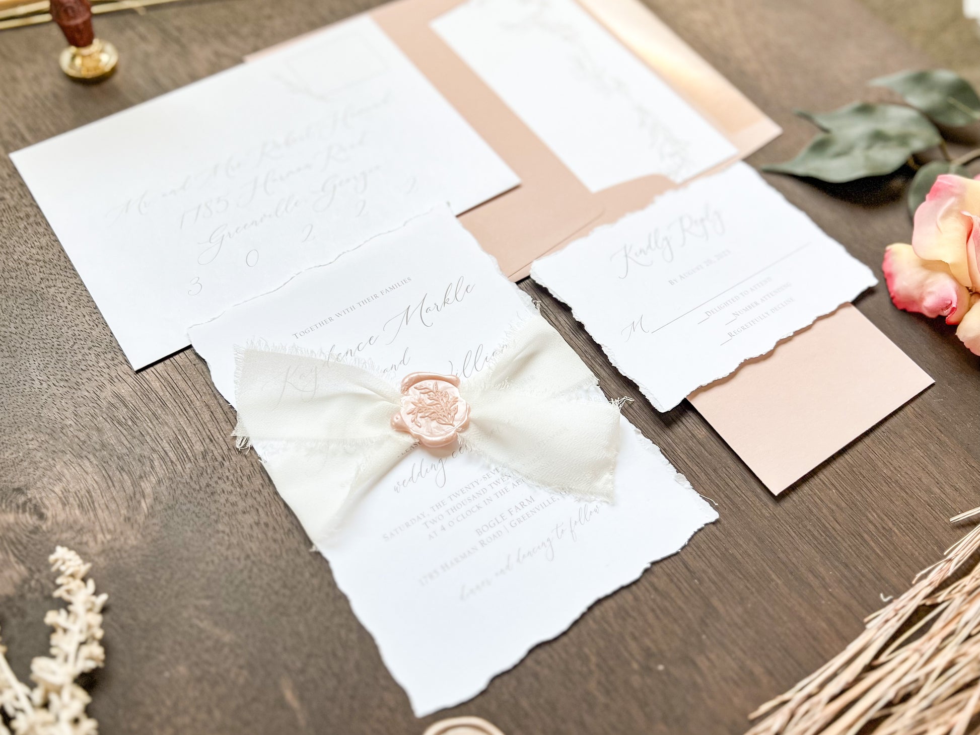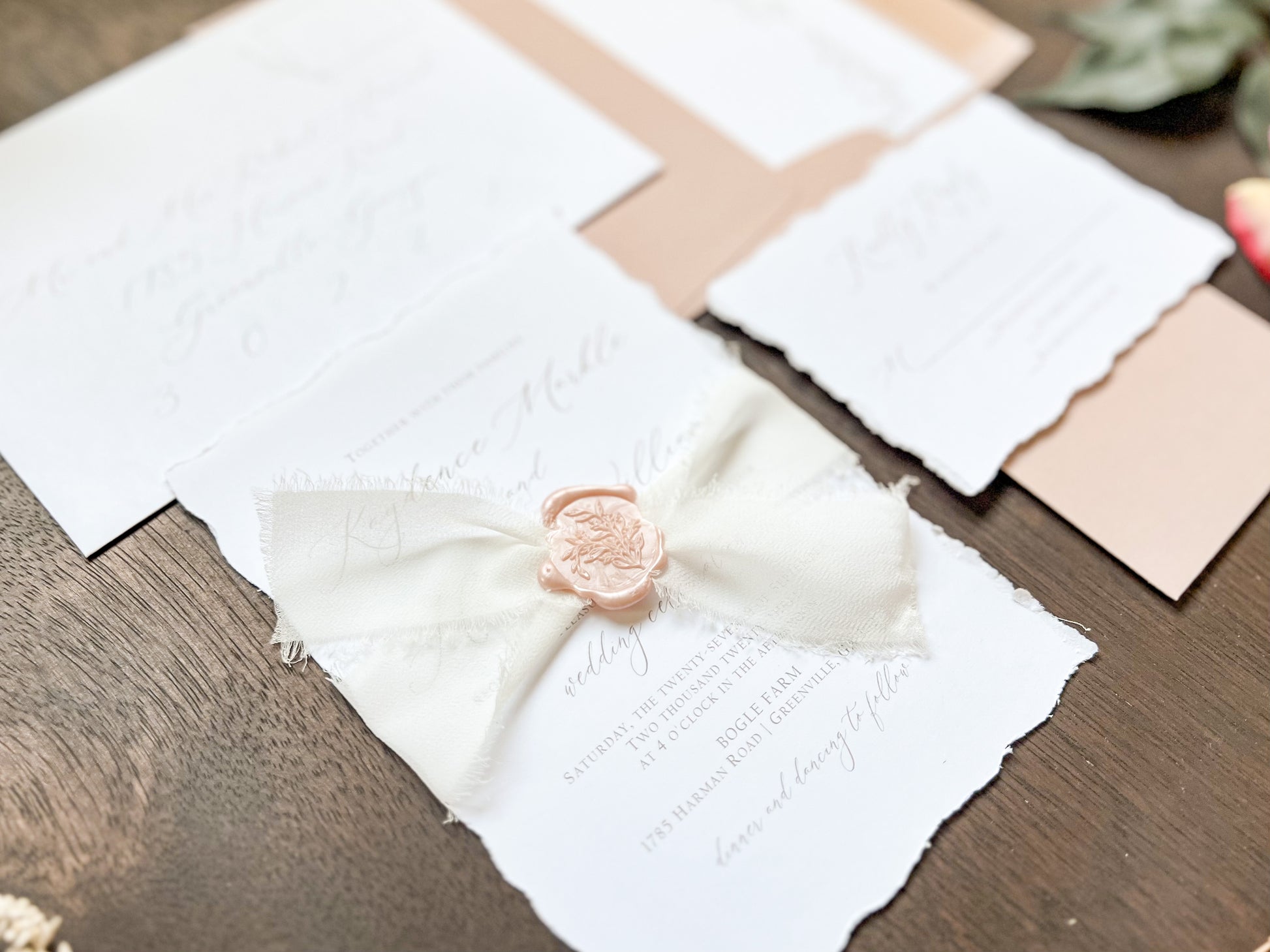 Soft and Sweet Wedding Invitation with Deckled Edging, White Chiffon Ribbon & Blush Pink Wax Seal