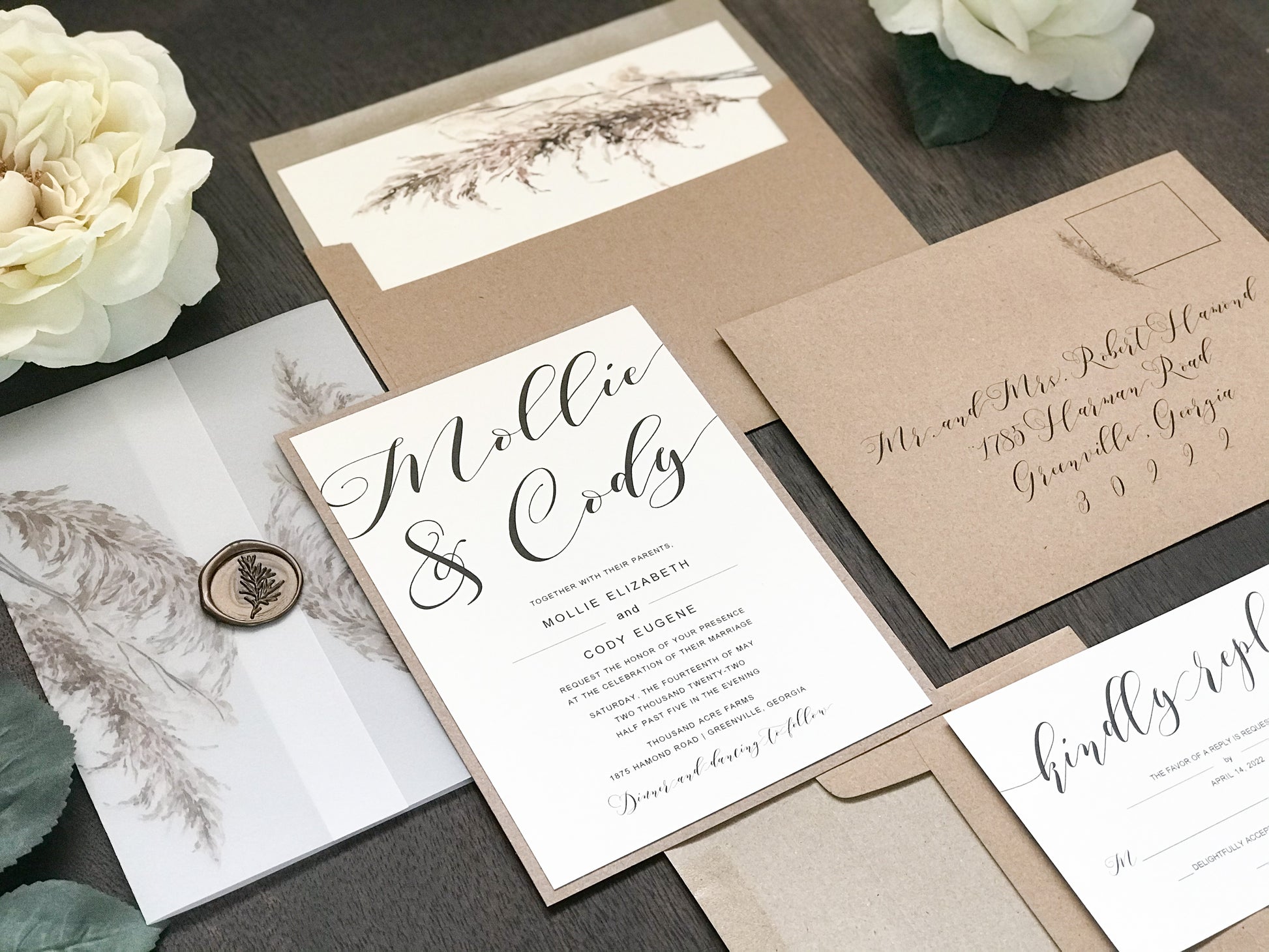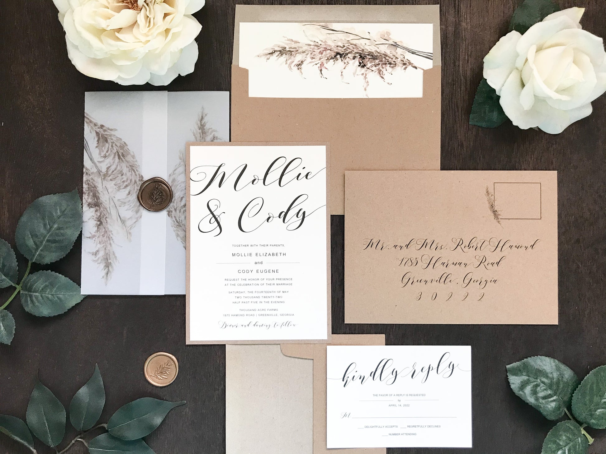 This elegant boho wedding invitation features bold modern calligraphy printed on smooth ivory cover stock, beautifully matted to a rustic kraft backer. It is wrapped in pampas grass vellum and secured with a botanical chocolate colored wax seal, creating a warm and natural aesthetic. Other wax colors available. Please inquire for your color of choice. Can also be printed on white stock as well. Just add the color change in the notes at checkout.