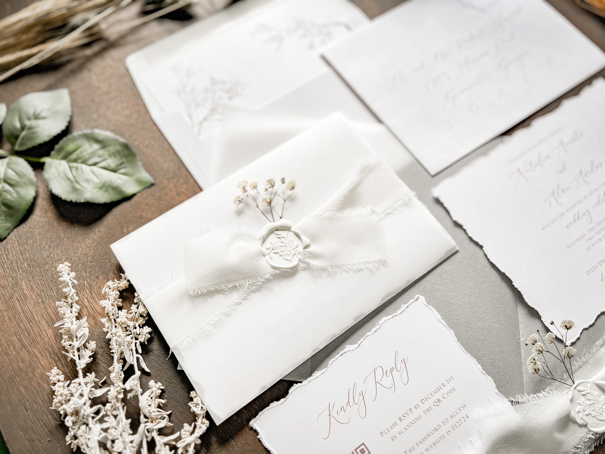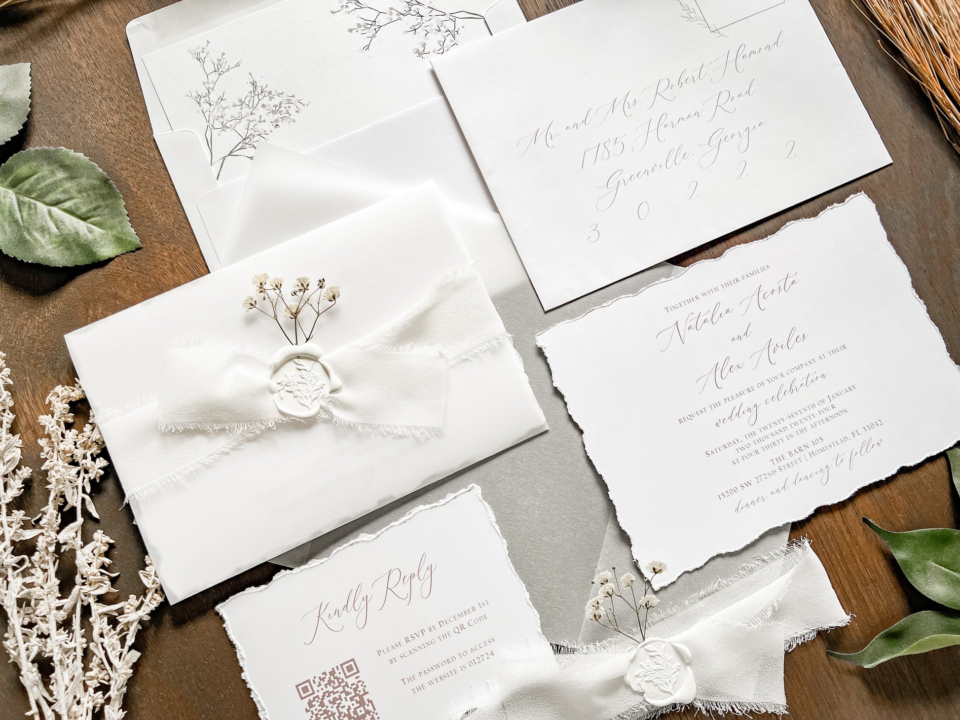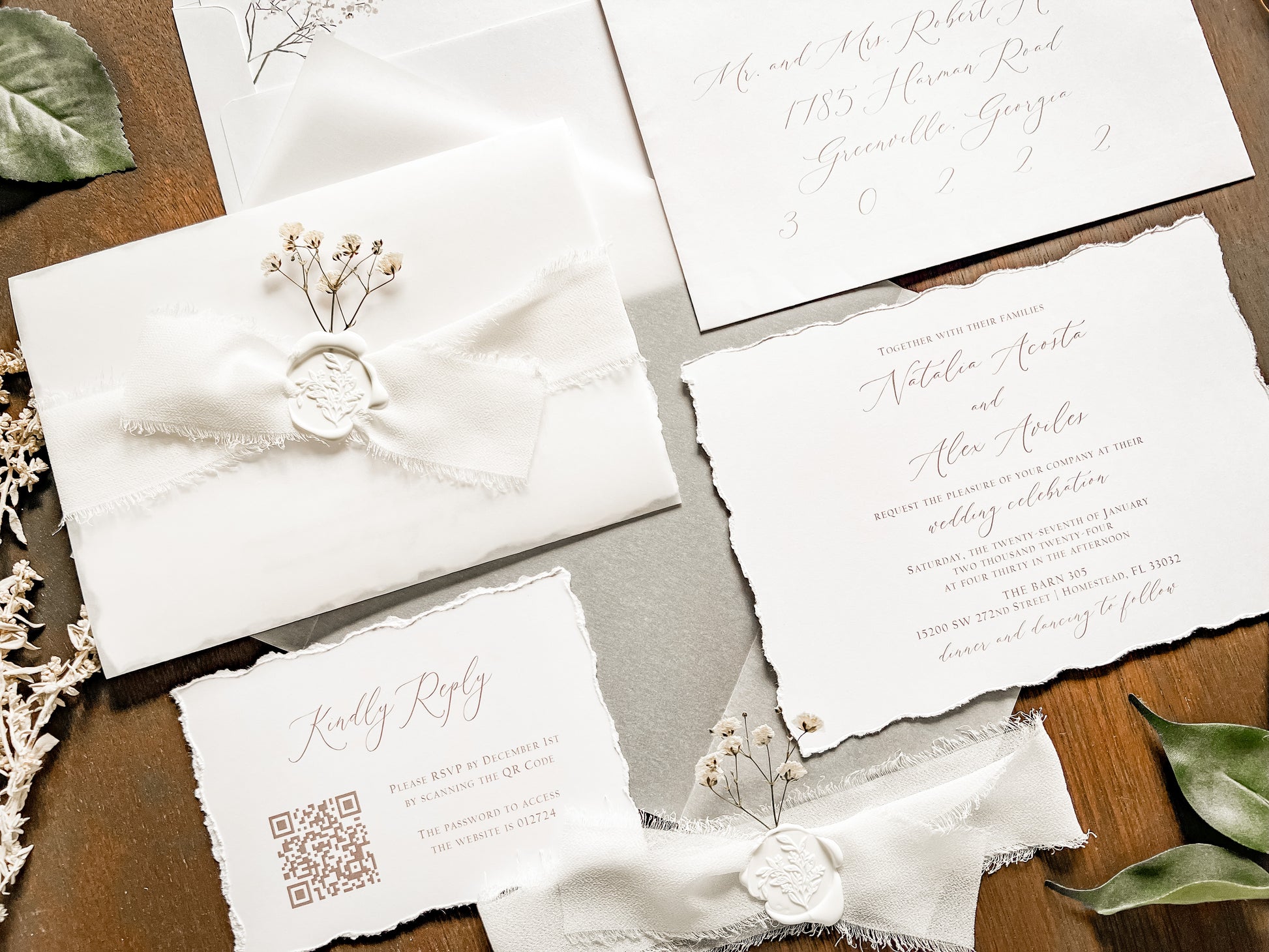 This modern elegant style wedding invitation is sure to impress! It’s printed on 100 lb white cover stock with deckled (hand torn) edging. Invitation is wrapped in vellum with white chiffon ribbon, a botanical white wax seal and dried pressed gypsophila (baby's breath). Other wax and ribbon colors available. Please inquire for your color of choice. QR code RSVPs and insert cards, if ordered, are placed inside the vellum atop the invitation before being wrapped.