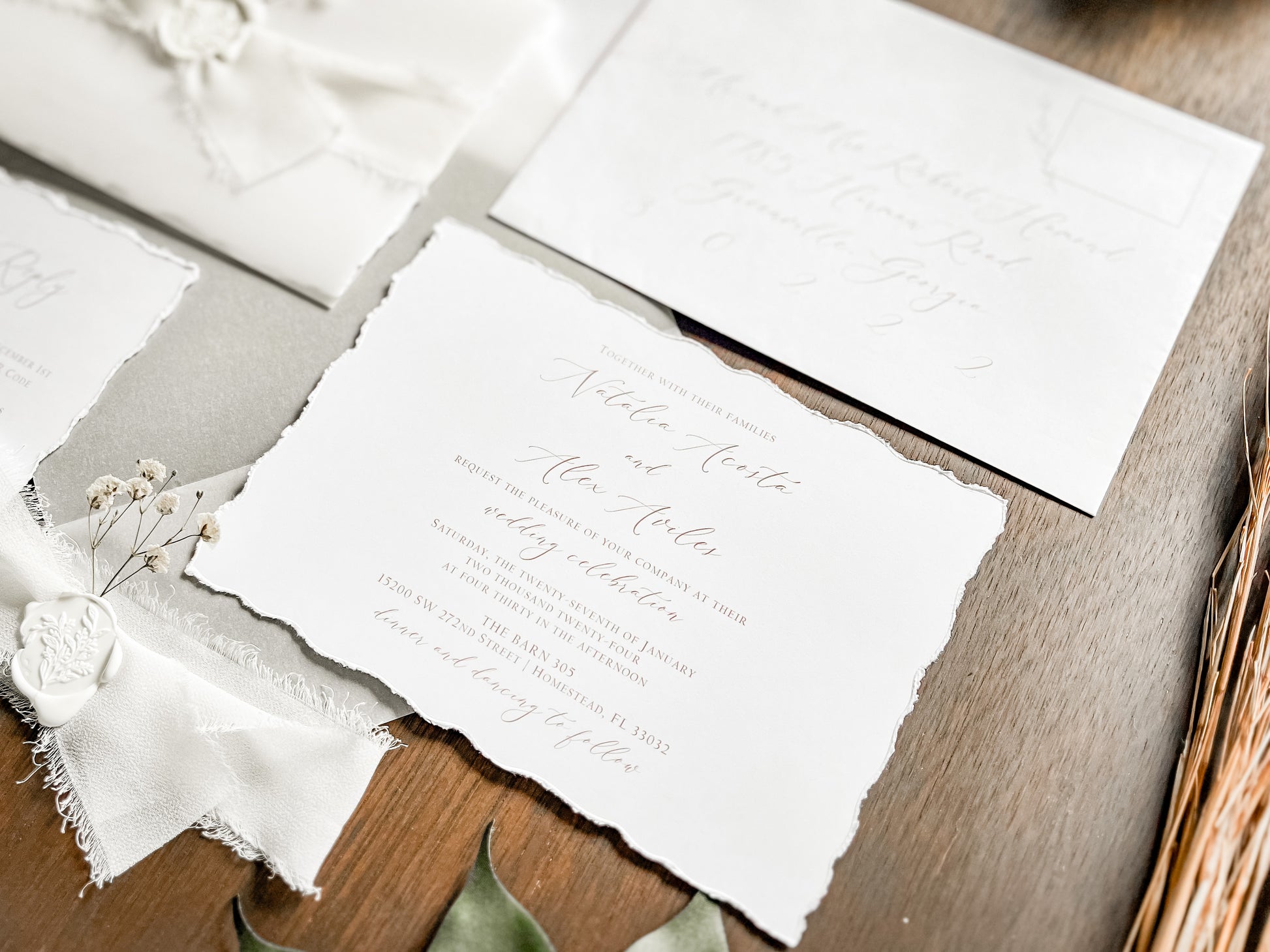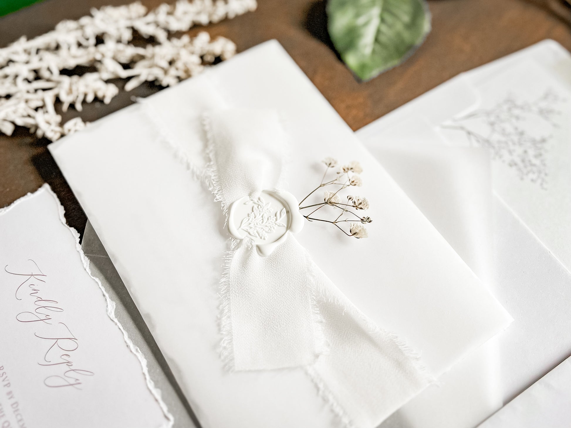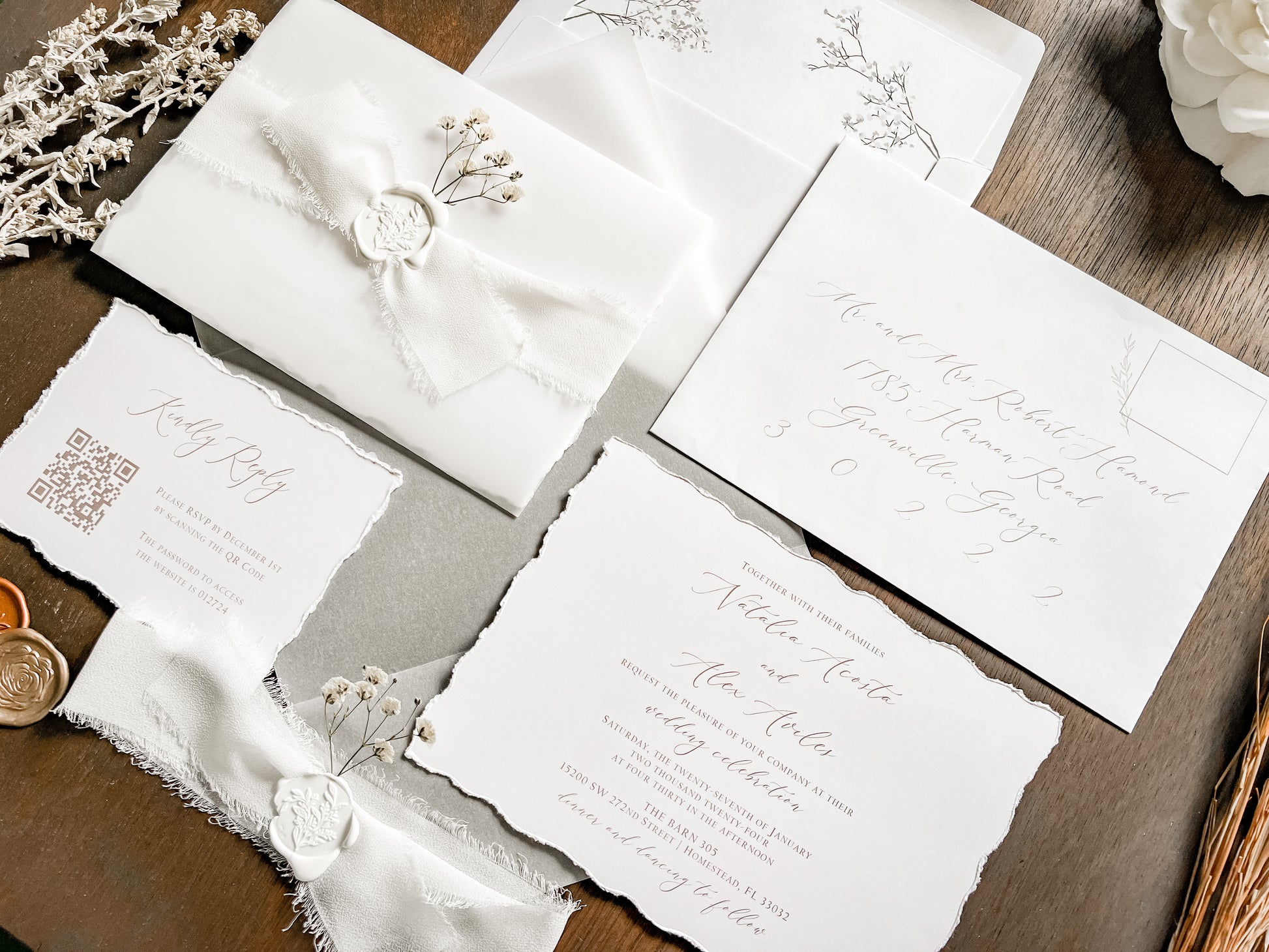 This modern elegant style wedding invitation is sure to impress! It’s printed on 100 lb white cover stock with deckled (hand torn) edging. Invitation is wrapped in vellum with white chiffon ribbon, a botanical white wax seal and dried pressed gypsophila (baby's breath). Other wax and ribbon colors available. Please inquire for your color of choice. QR code RSVPs and insert cards, if ordered, are placed inside the vellum atop the invitation before being wrapped.