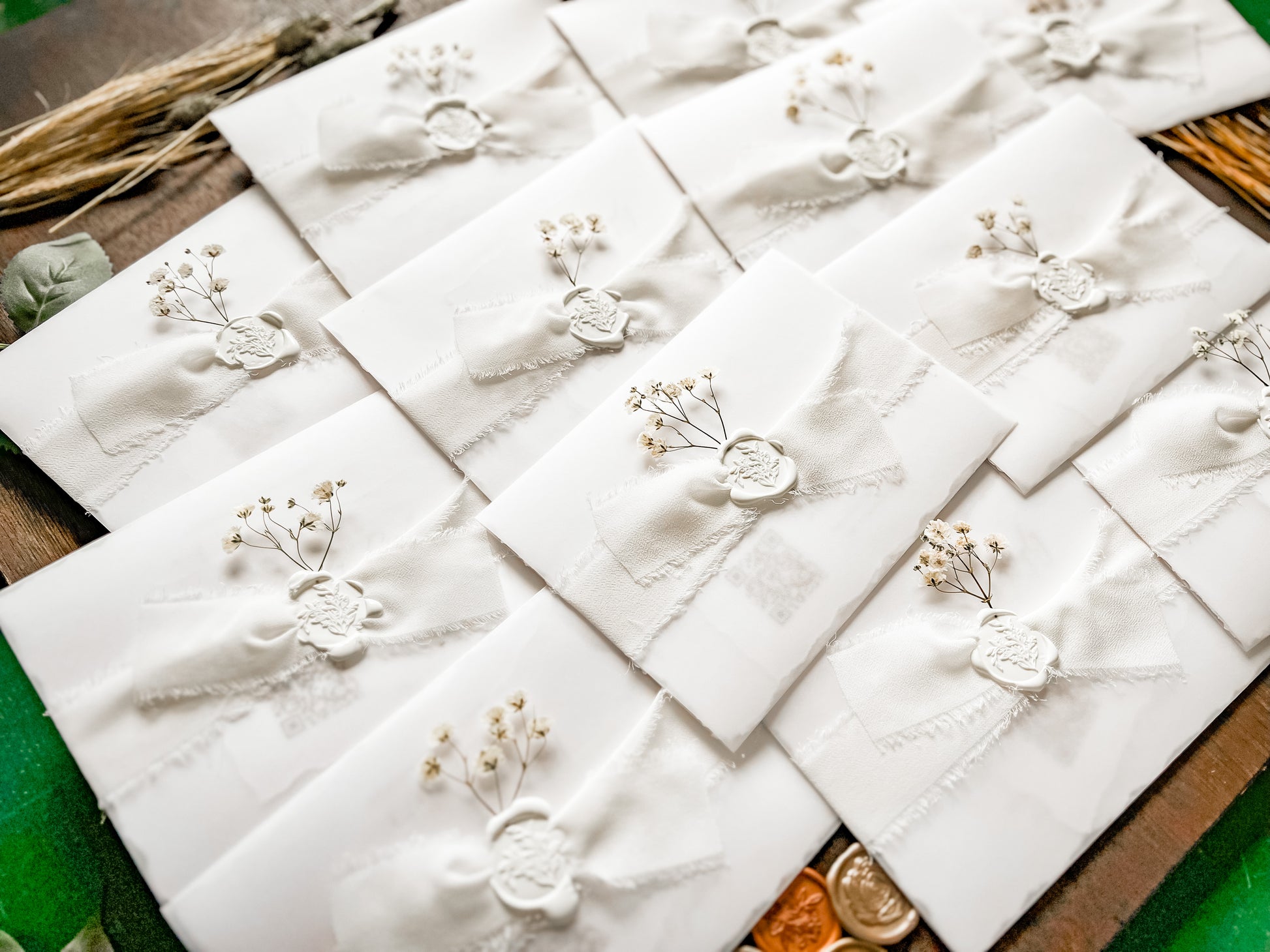 White Baby’s Breath Wedding Invitation with Deckled Edging, QR code RSVP, Vellum, Chiffon Ribbon and Wax Seal