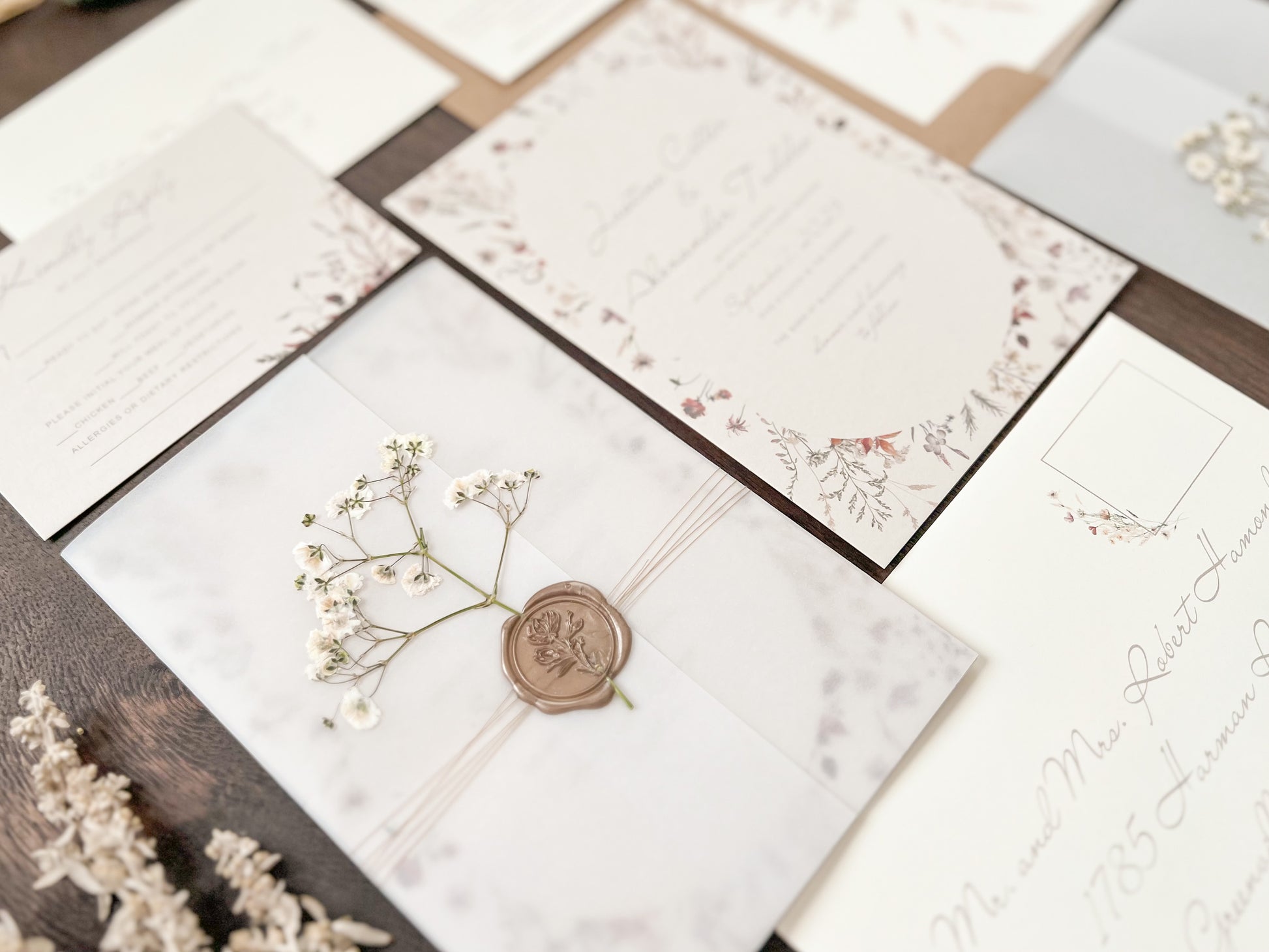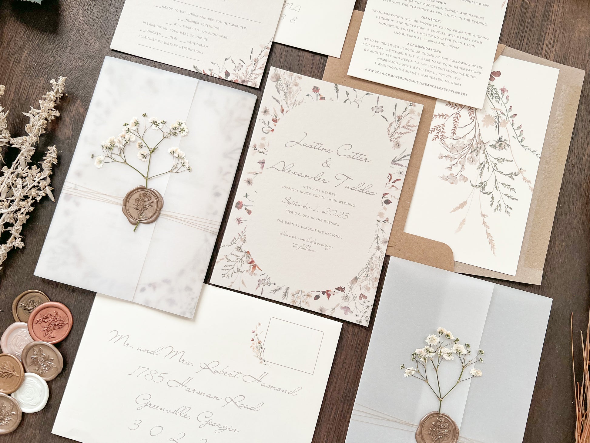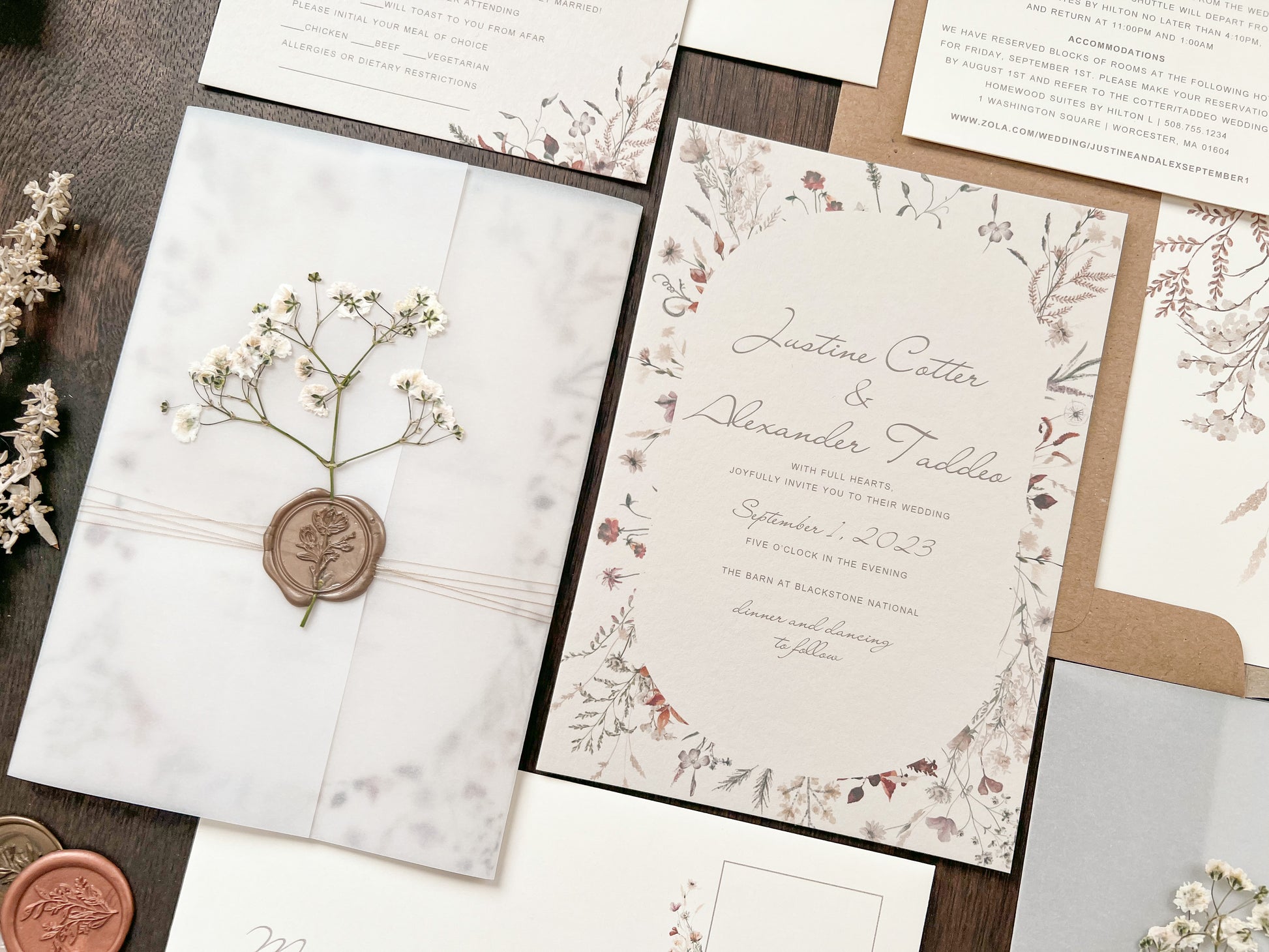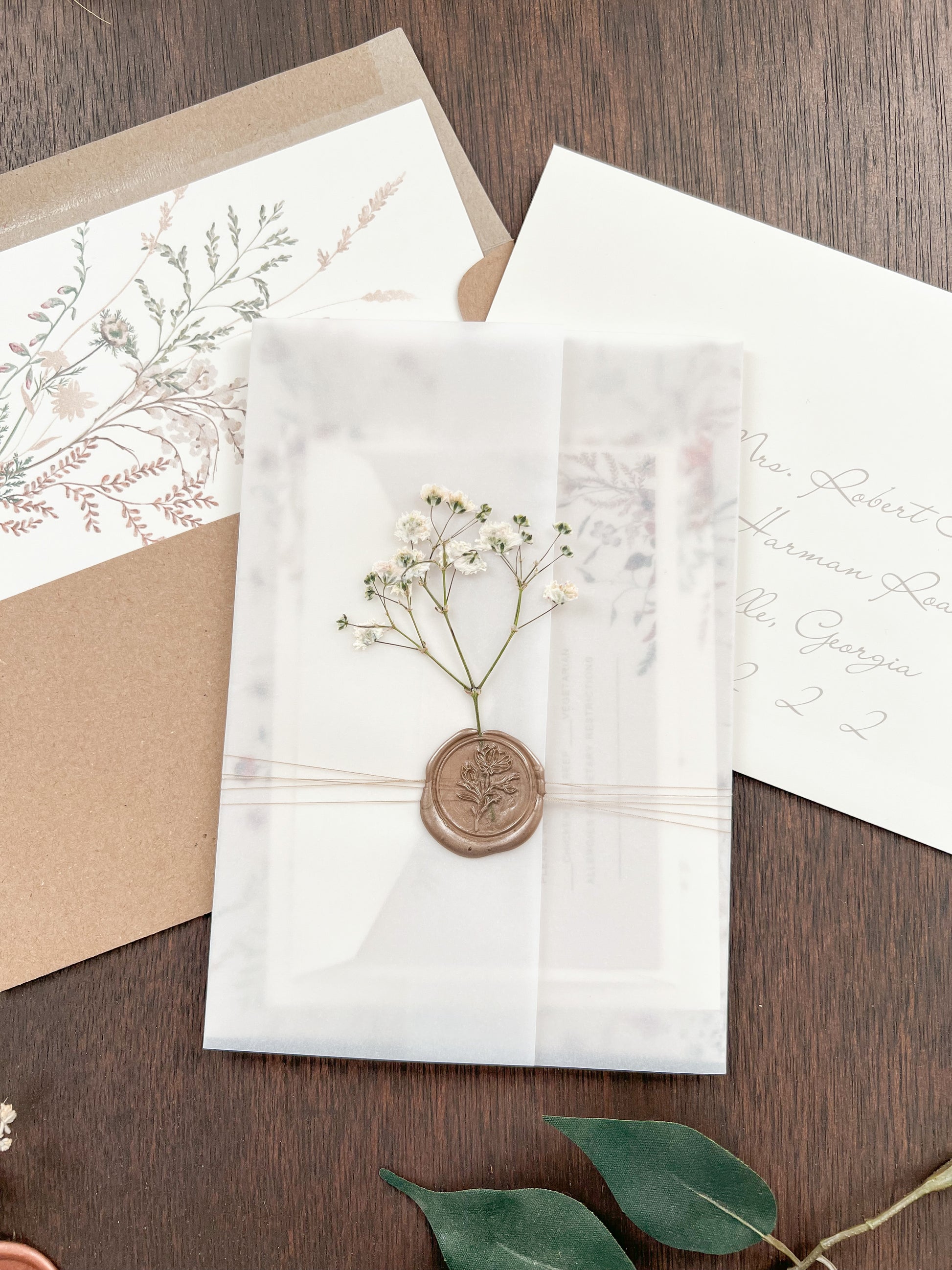 Wildflower & Baby’s Breath Wedding Invitation with Deckled Edging, Vellum Wrap and Wax Seal