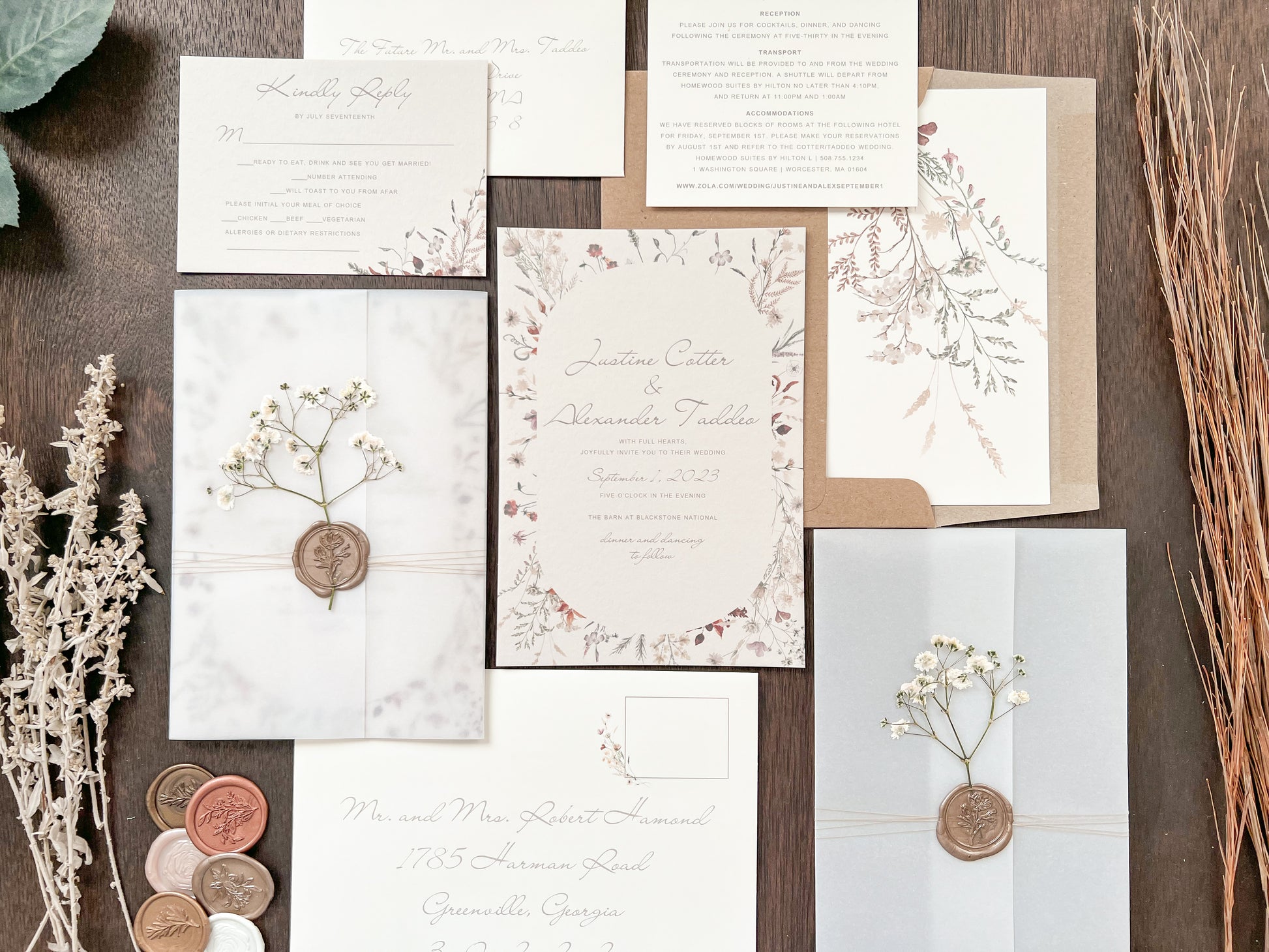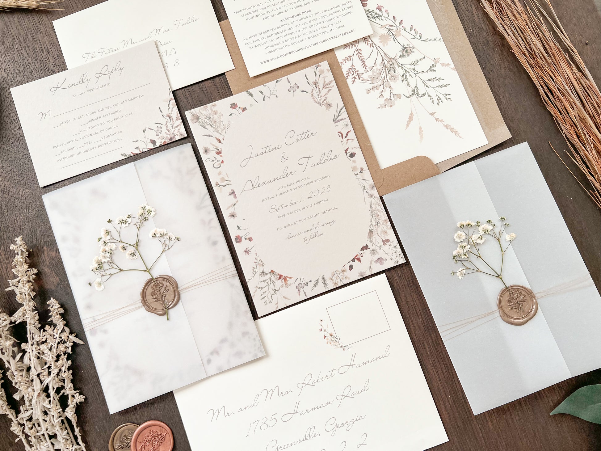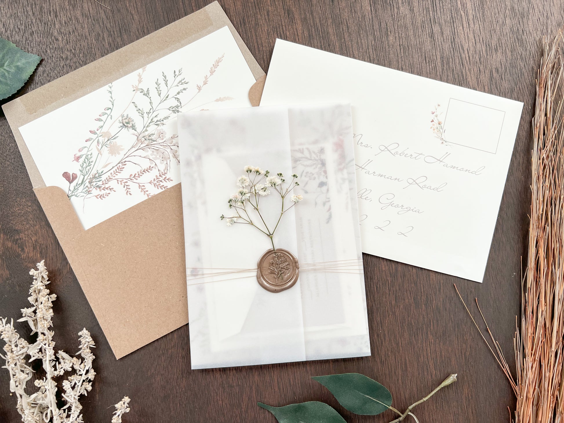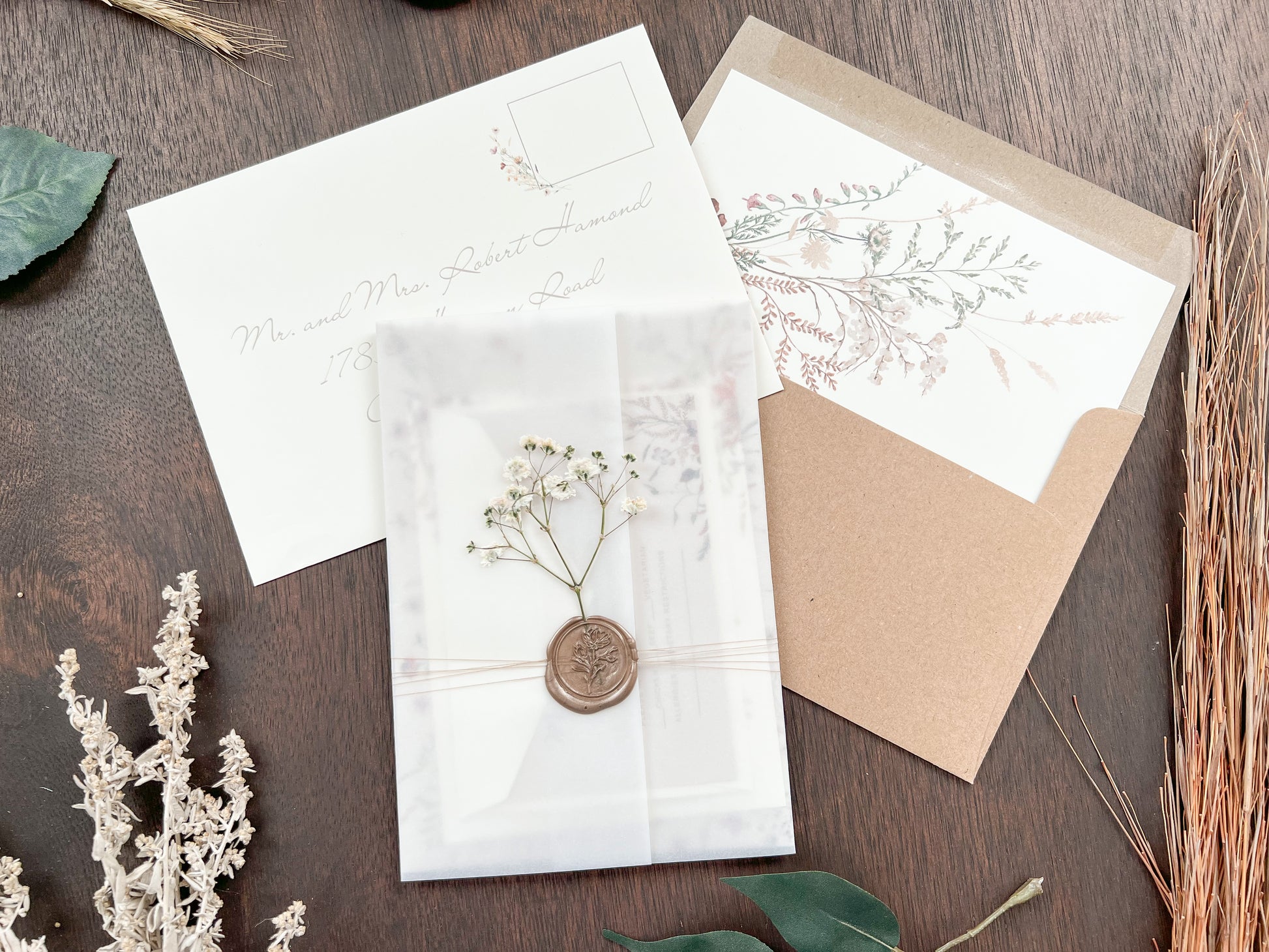 Wildflower & Baby’s Breath Wedding Invitation with Deckled Edging, Vellum Wrap and Wax Seal