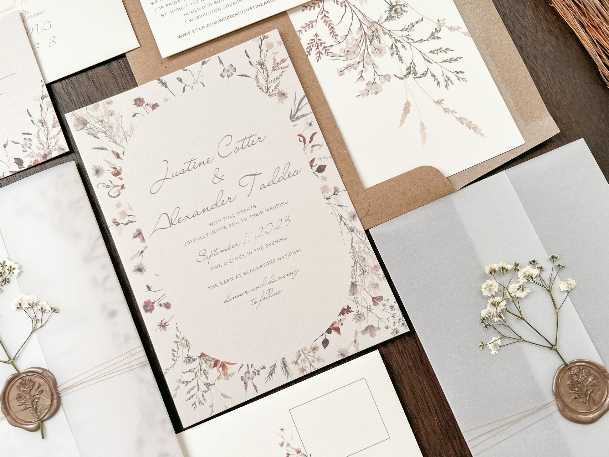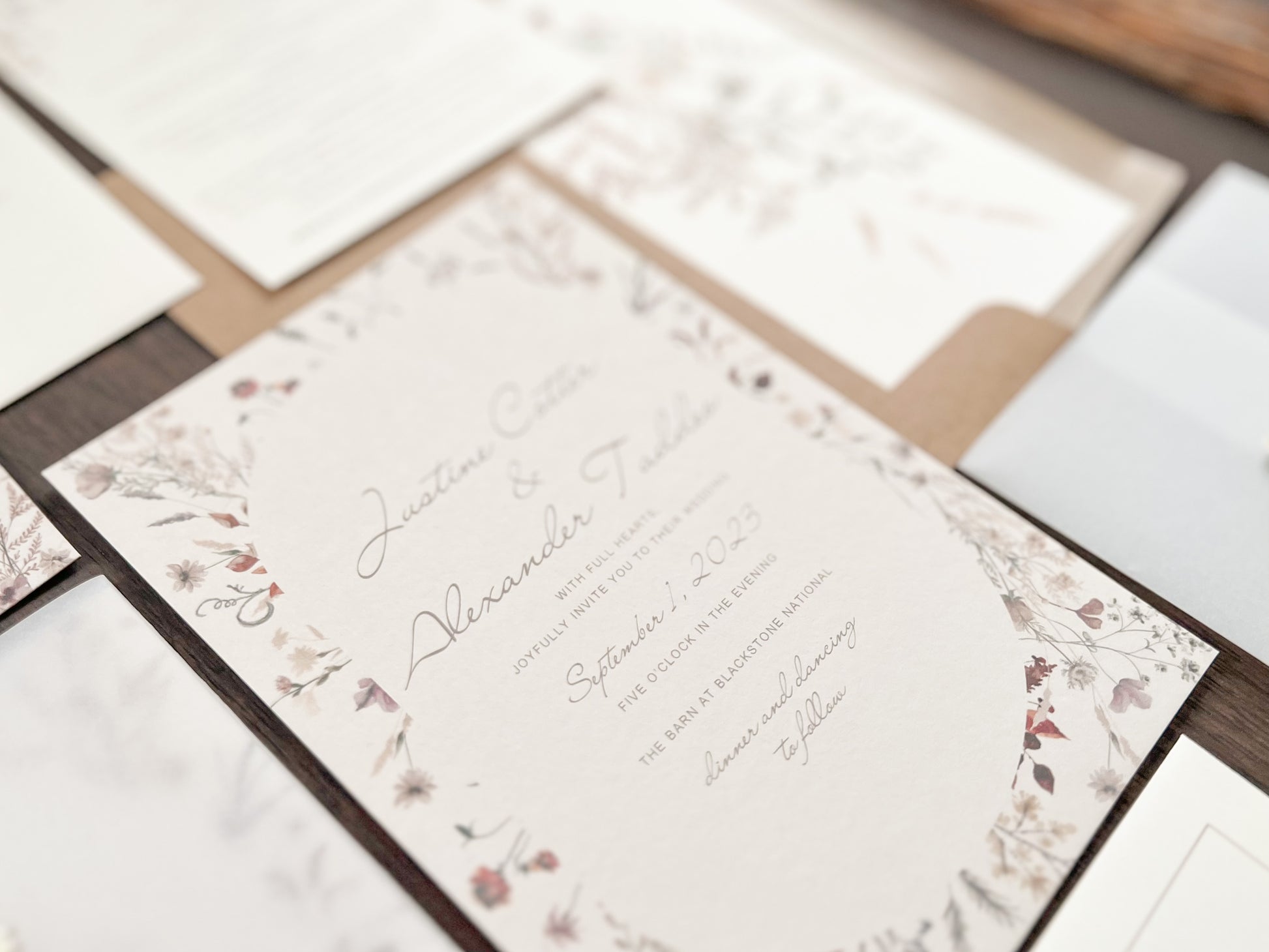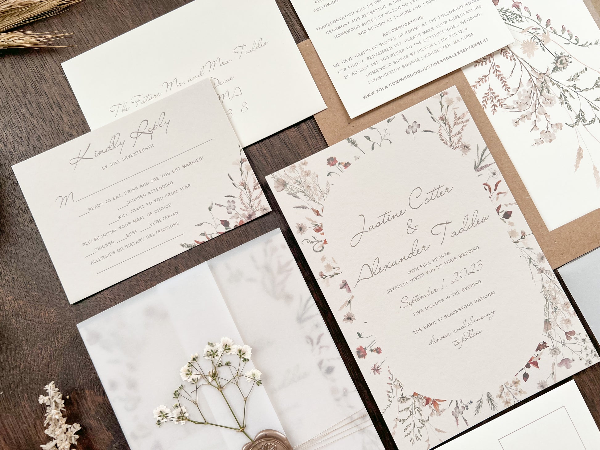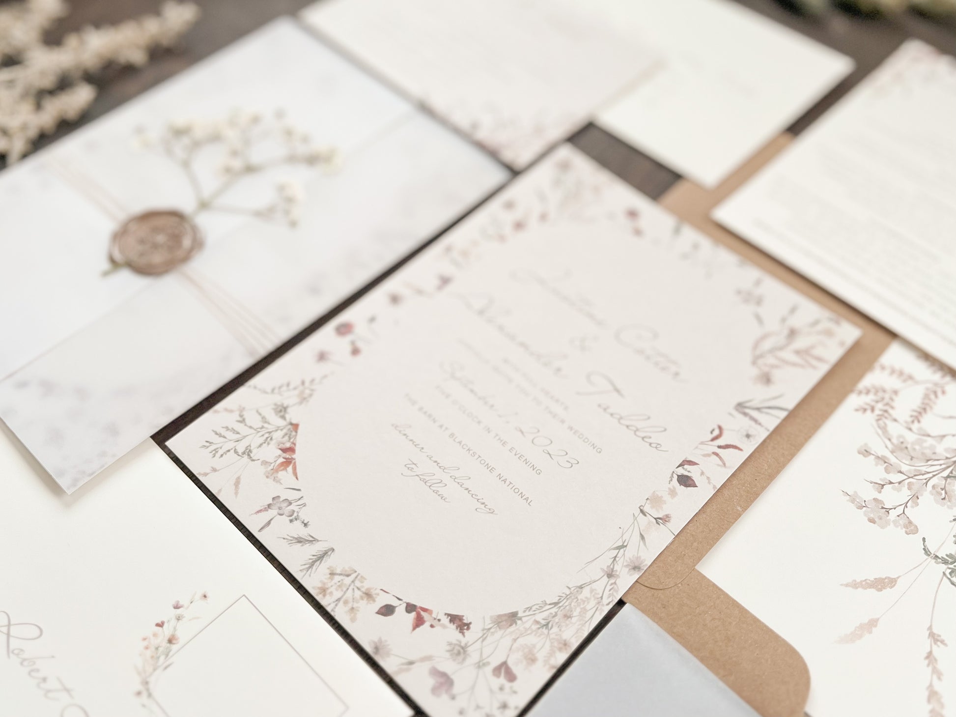 Wildflower & Baby’s Breath Wedding Invitation with Deckled Edging, Vellum Wrap and Wax Seal