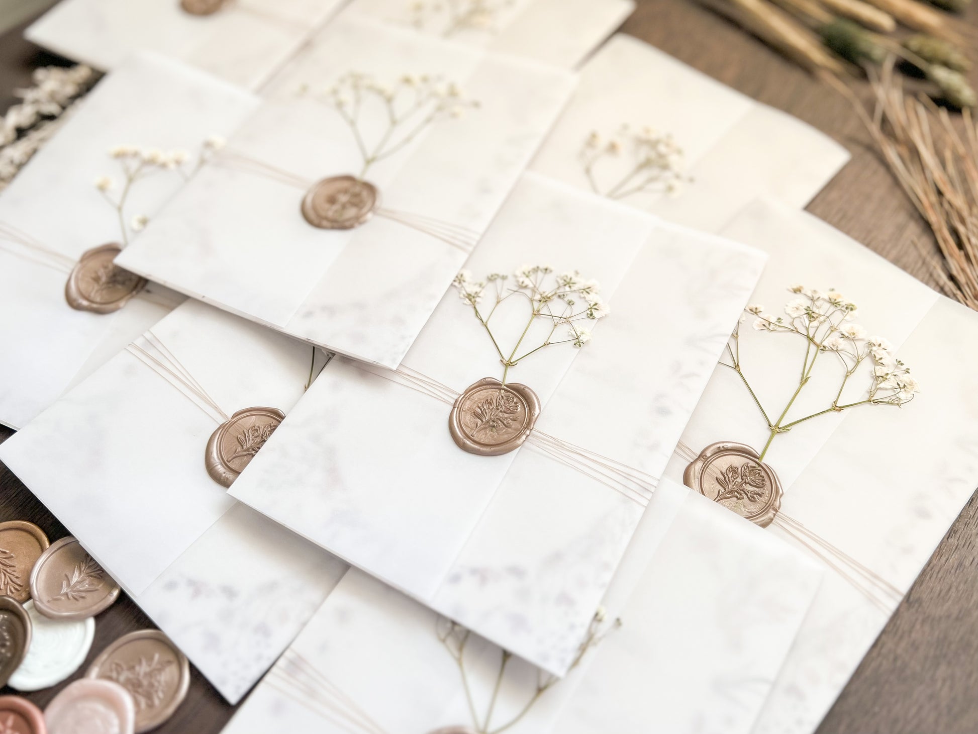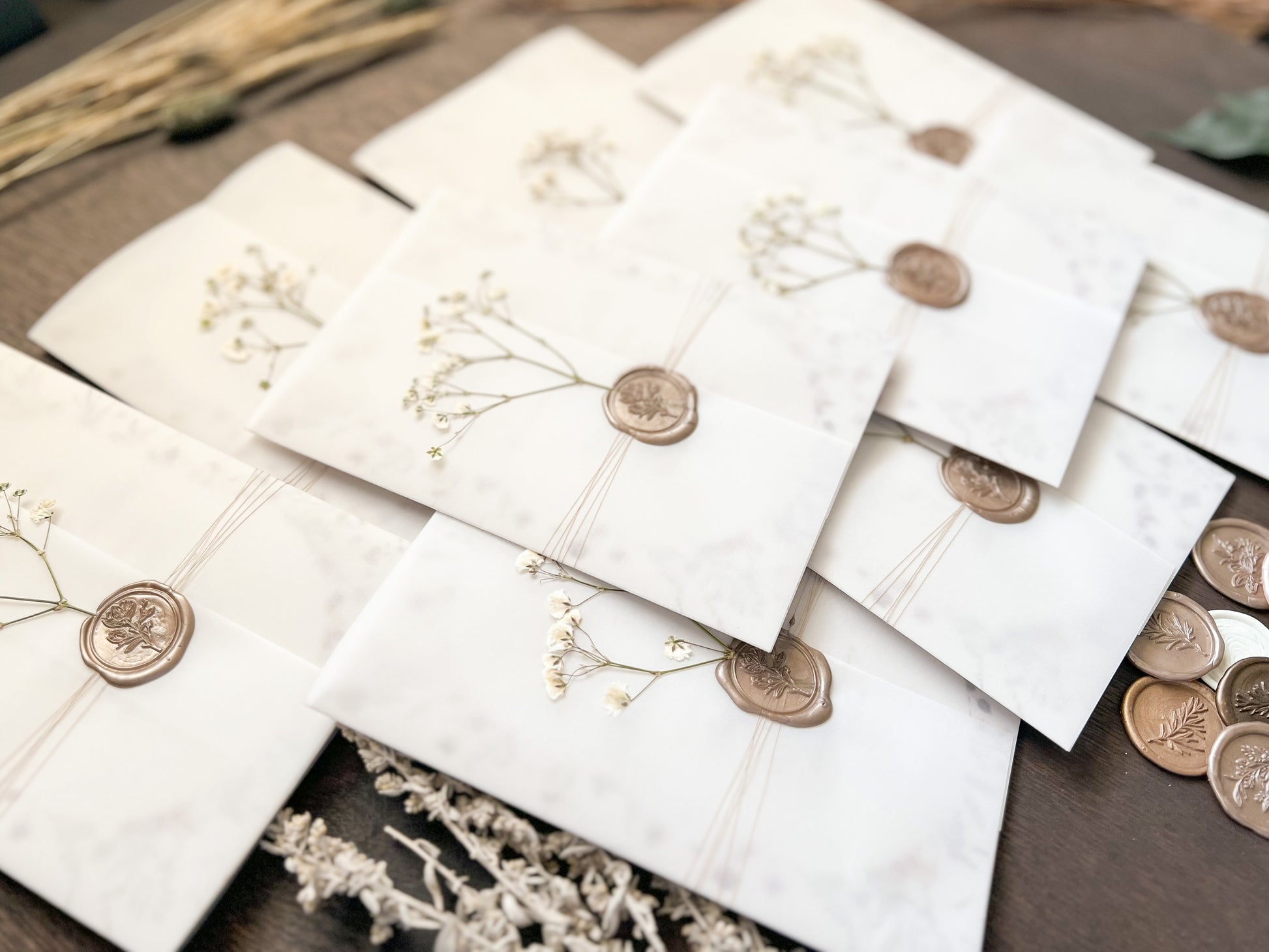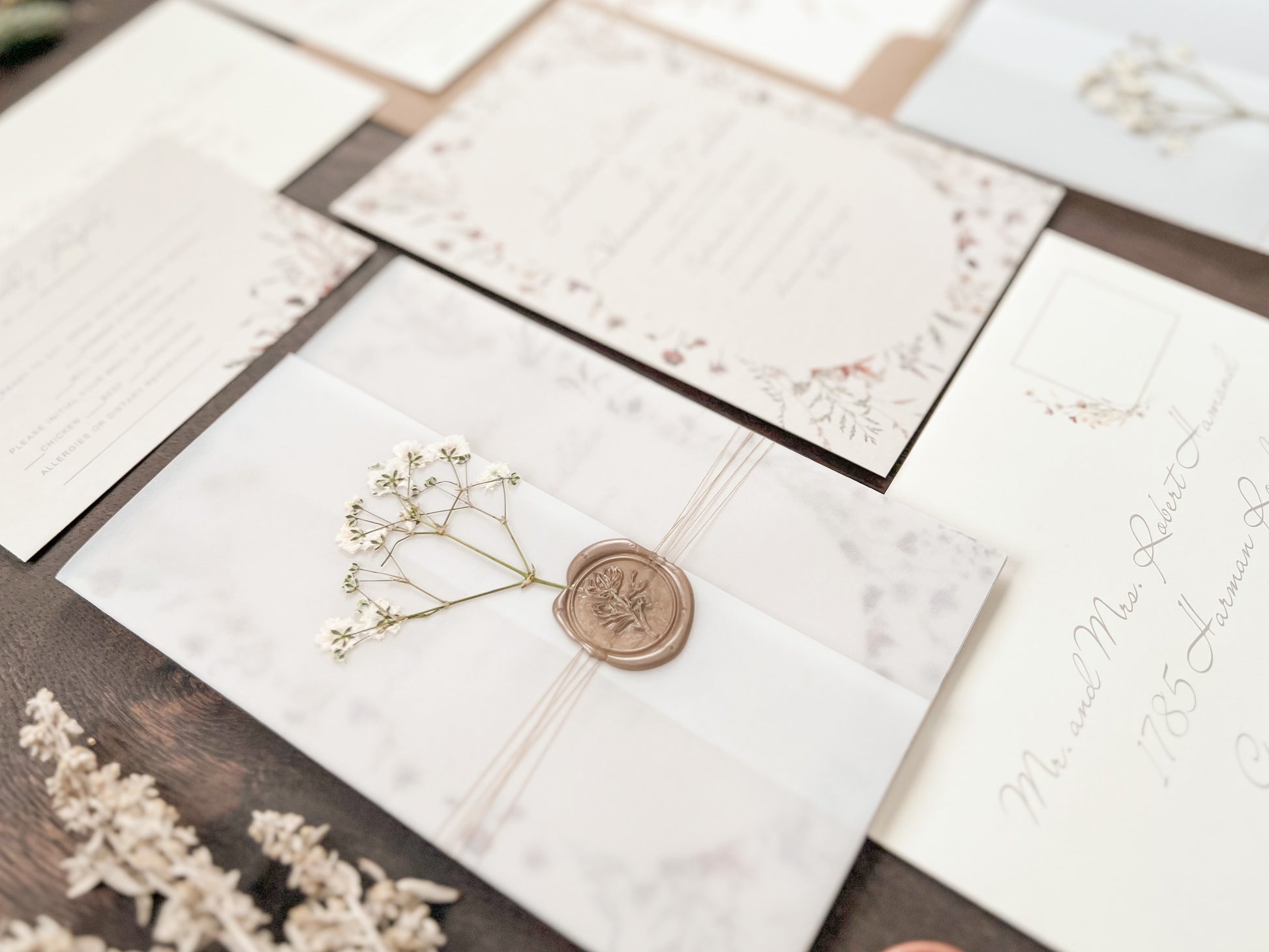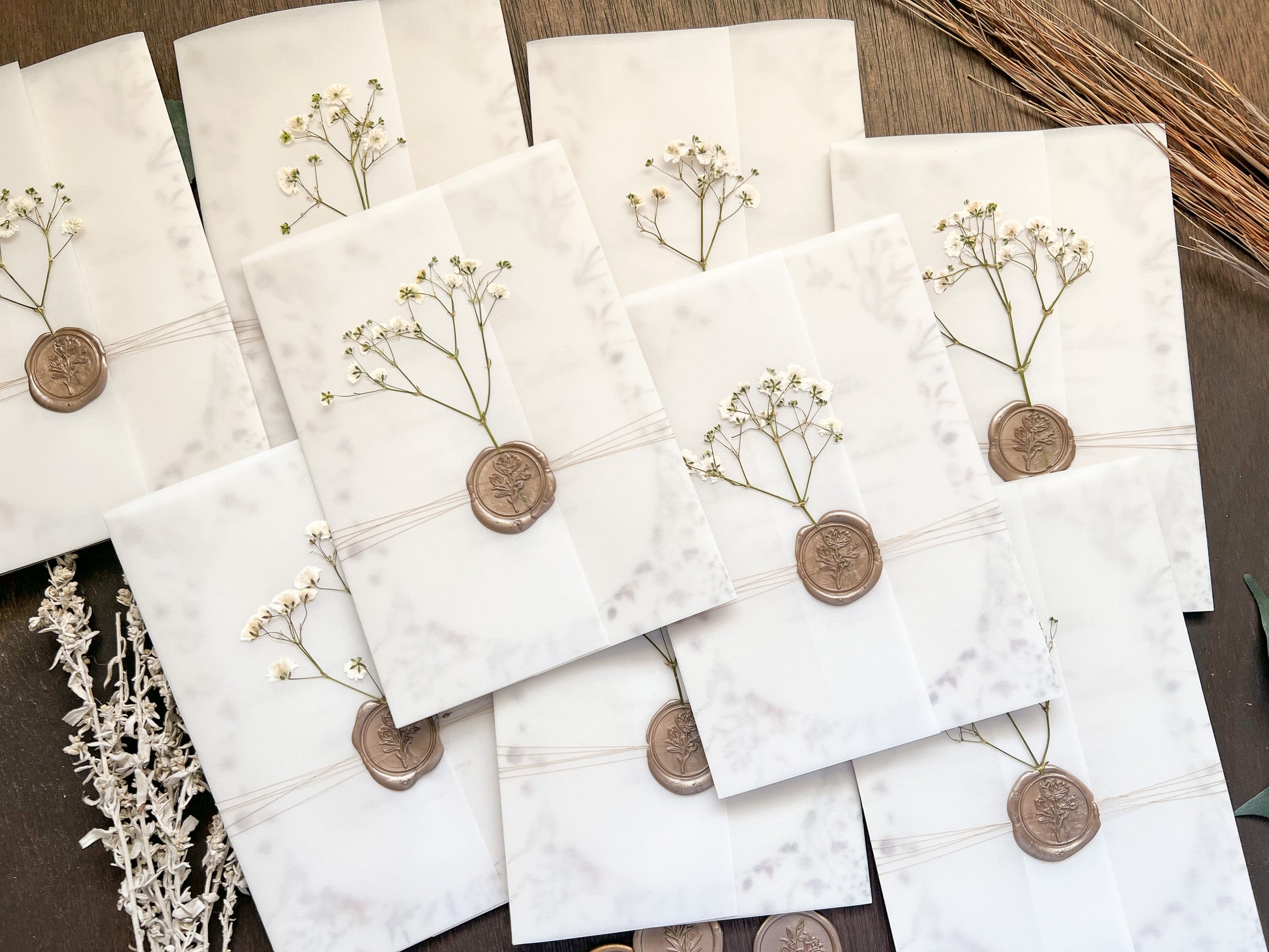- 5 x 7 invitation wrapped in vellum and thread with wax seal and baby’s breath