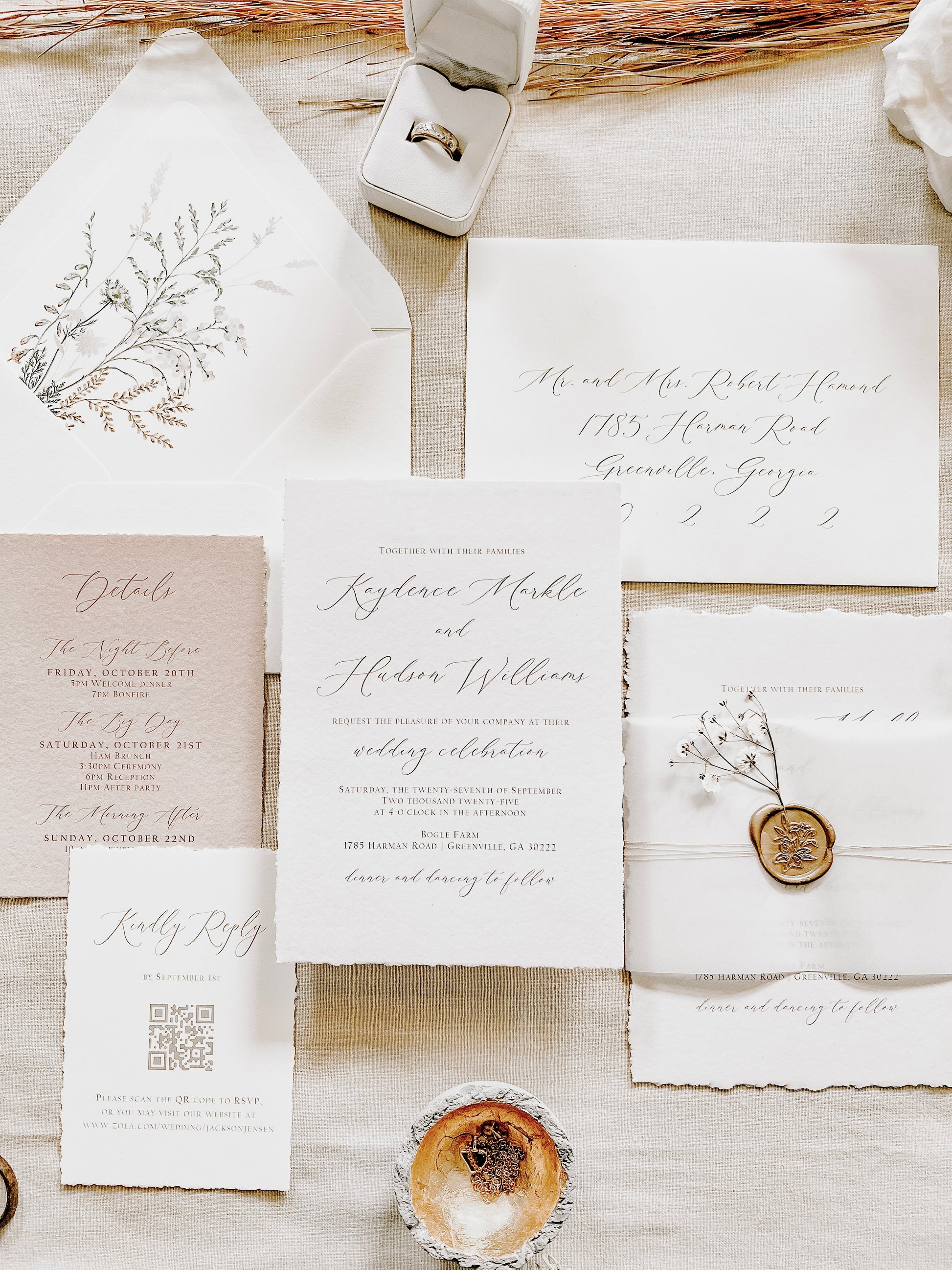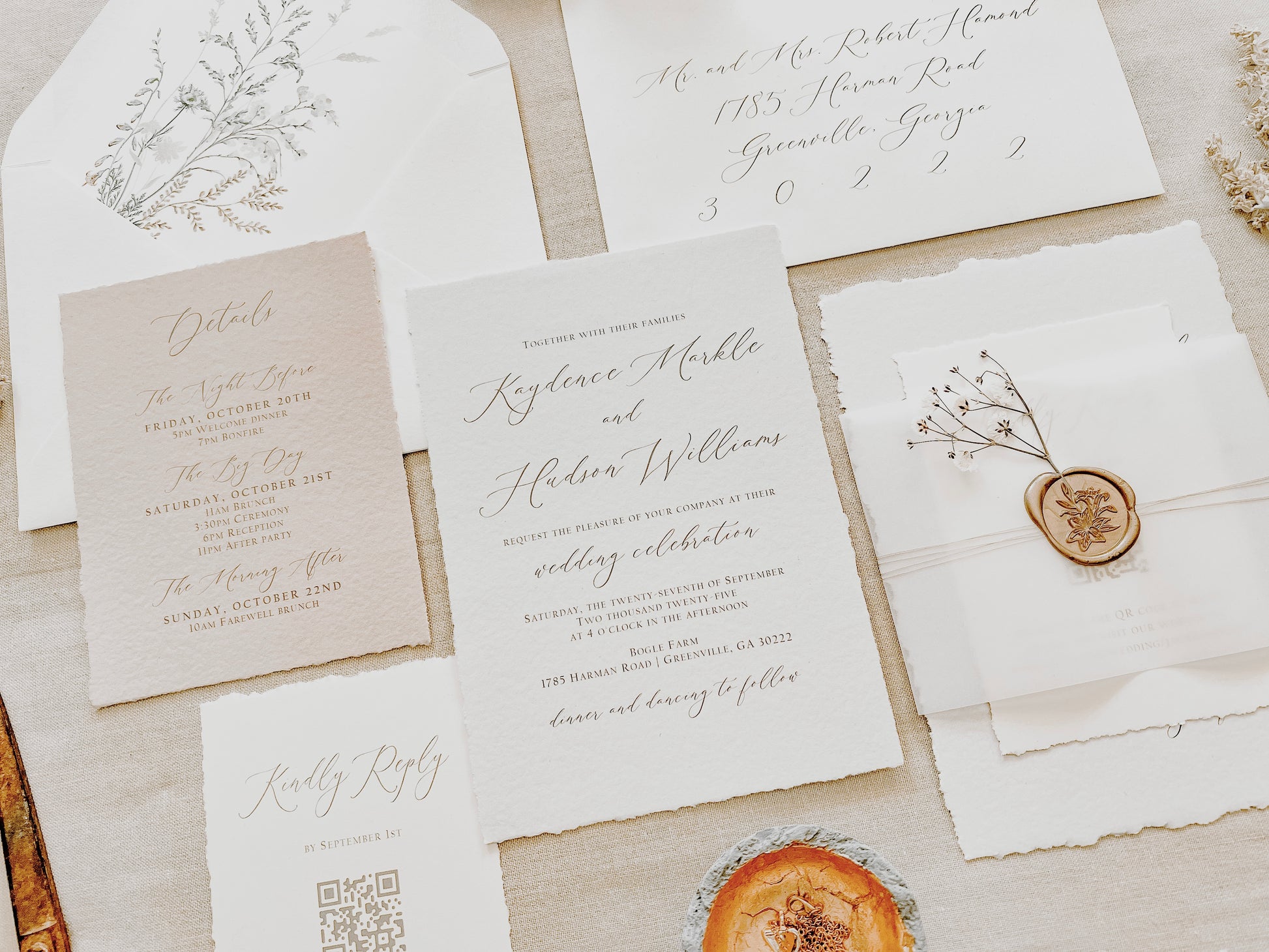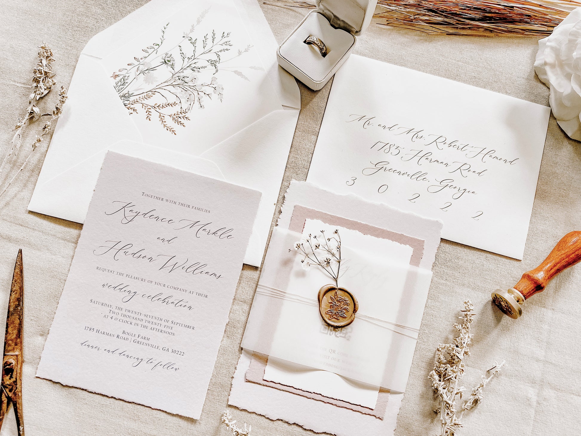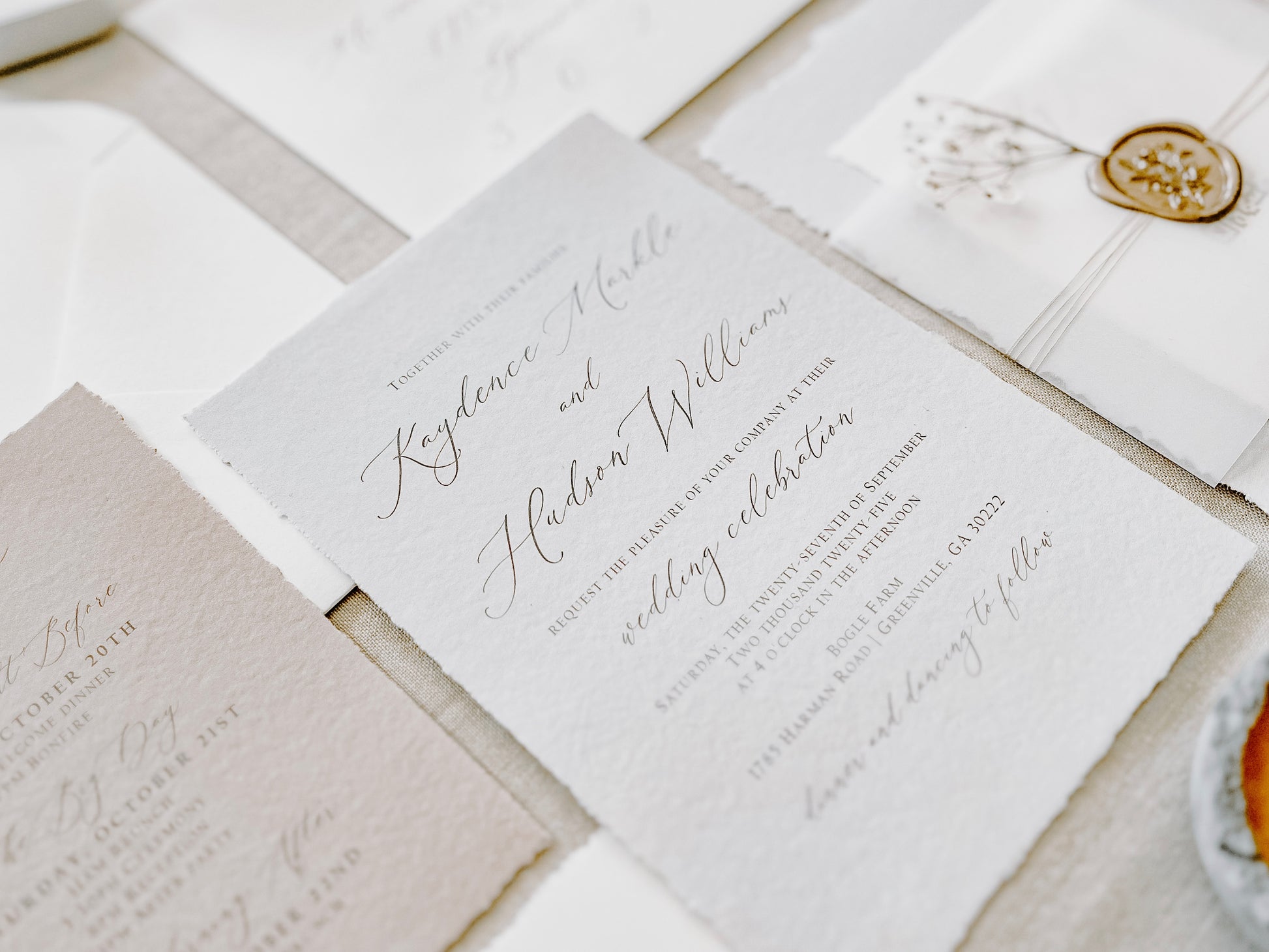 If you love this invitation but are looking for a more cost-effective option, check out this invitation here that's digitally printed on cover stock with hand torn edges instead of handmade paper.