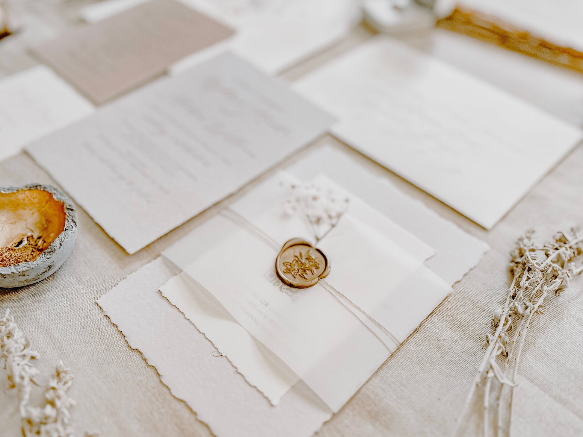 Wrap your invitation in understated elegance with a wide vellum belly band, hand-tied with khaki thread and sealed with antique gold wax. A sprig of dried, pressed gypsophila (baby’s breath) adds a soft, organic touch. Choose from a variety of wax colors and stamps. Some designs are exclusive to Creative Custom Prints!